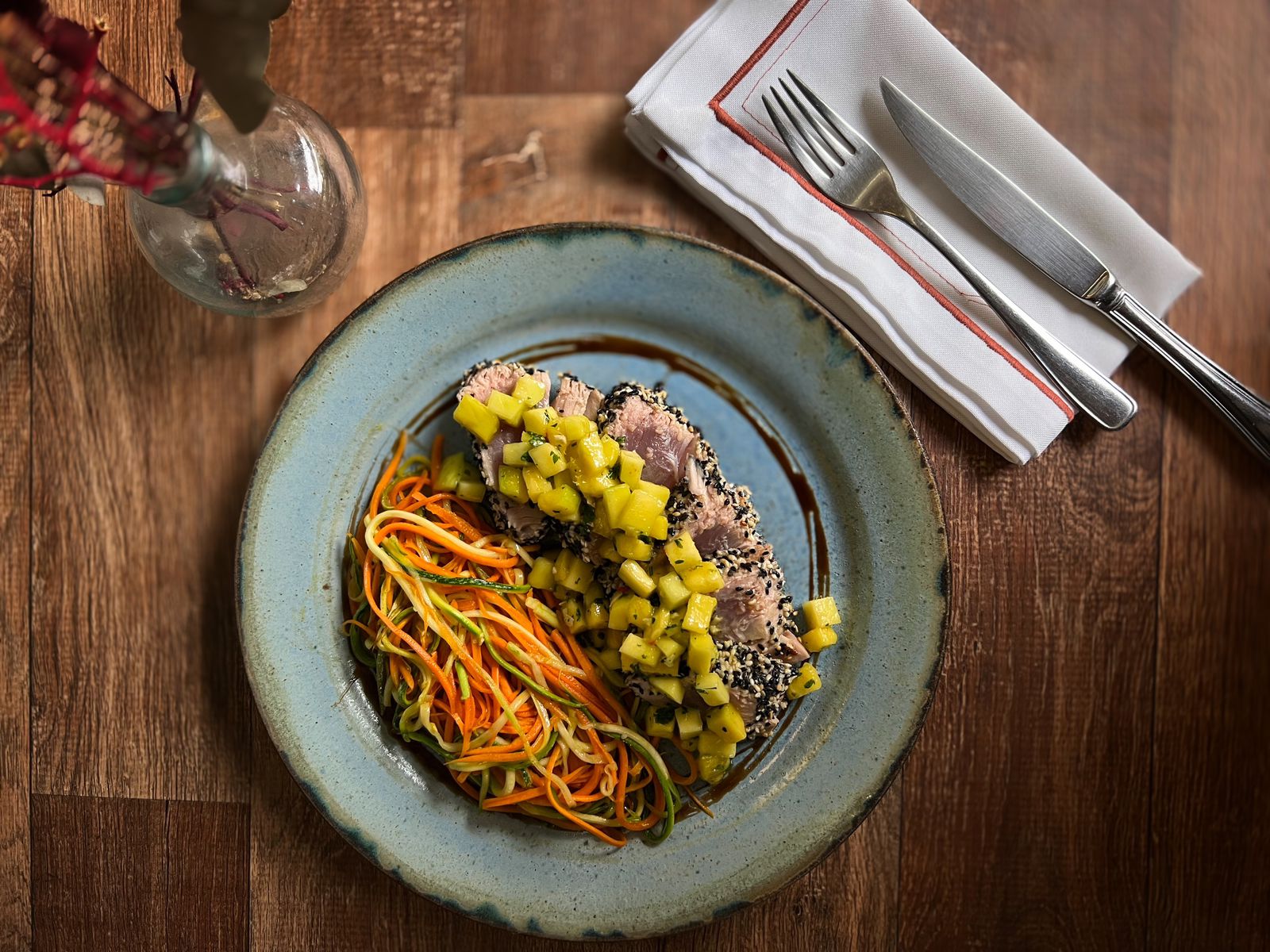 Atum com salsa de manga picante e Juliene de legumes